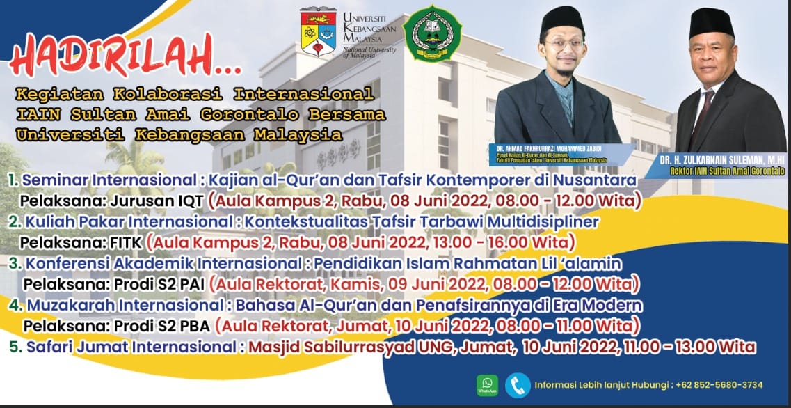Kegiatan kolaborasi internasional yang digagas oleh Pascasarjana IAIN Sultan Amai Gorontalo dengan menghadirkan Dr. Ahmad Fakhrurrazi bin Mohammed Zabidi selama empat hari sejak selasa, 7/06/2022 hingga Jumat, 10/06/2022 dalam serangkaian kegiatannya melibatkan dosen Prodi PAI Dr. Buhari Luneto, M.Pd. dan dosen tamu Prodi PAI Dr. Ridwan Tohopi, M.Pd. Jadwal kegiatan dimaksud dapat ditampilkan pada tabel berikut ini: