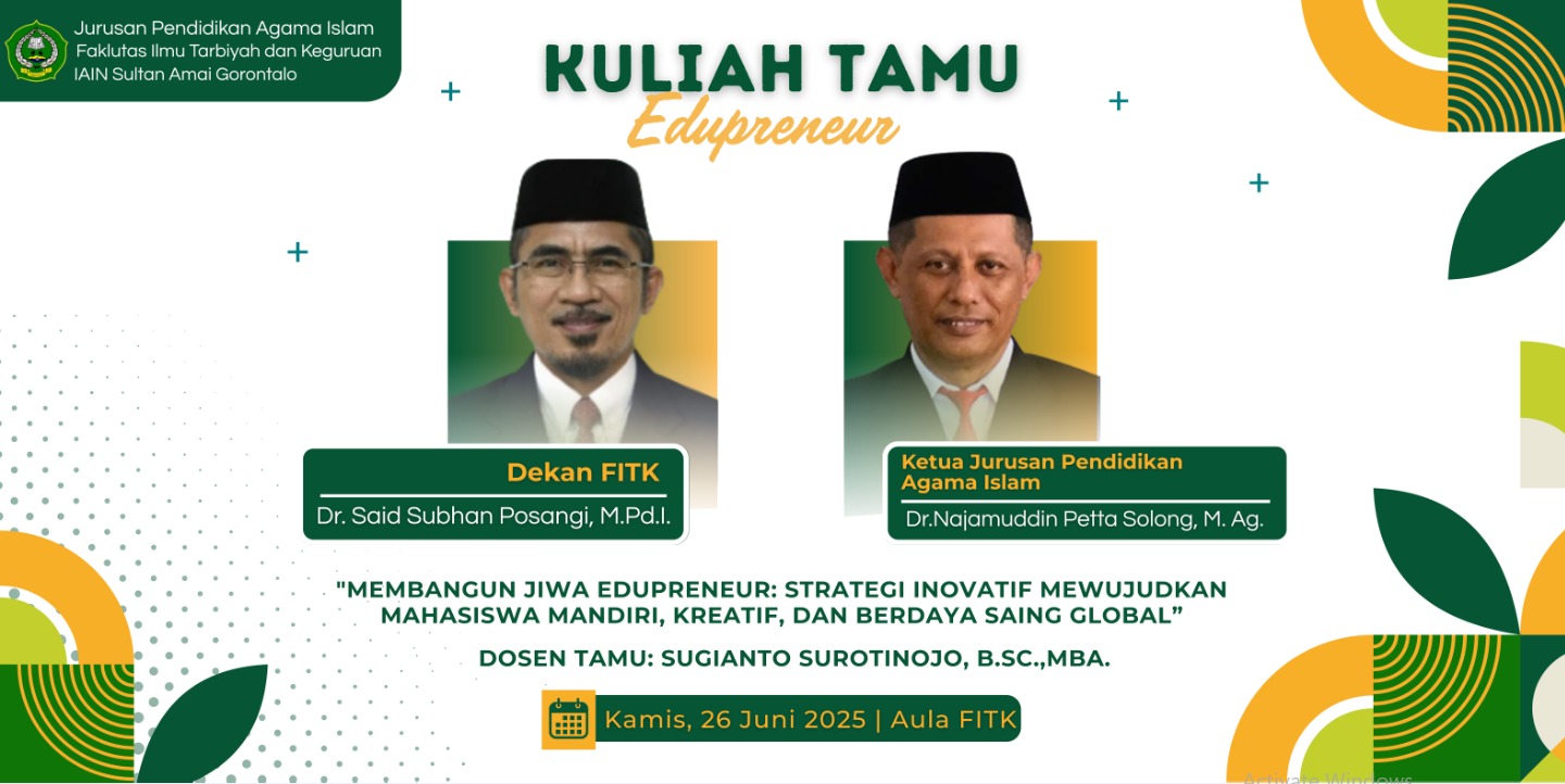 Gorontalo, 26 Juni 2025 – Jurusan Pendidikan Agama Islam (PAI) Fakultas Ilmu Tarbiyah dan Keguruan (FITK) IAIN Sultan Amai Gorontalo sukses menyelenggarakan Kuliah Tamu Edupreneurship yang menghadirkan Sugiyanto Surotinojo, BSc.,MBA. sebagai dosen tamu. Kegiatan ini merupakan bagian dari upaya jurusan untuk membekali mahasiswa dengan jiwa kewirausahaan dan kemampuan bersaing di era global.Kuliah tamu ini mengangkat tema inspiratif: “Membangun Jiwa Edupreneur: Strategi Inovatif Mewujudkan Mahasiswa Mandiri, Kreatif, dan Berdaya Saing Global.” Tema ini sangat relevan dengan tuntutan zaman, di mana lulusan perguruan tinggi diharapkan tidak hanya memiliki kompetensi akademik, tetapi juga jiwa inovasi dan kemandirian untuk menciptakan peluang.Acara yang dilaksanakan pada hari ini, 26 Juni 2025, ini disambut antusias oleh para mahasiswa dan civitas akademika Jurusan PAI. Kehadiran seorang akademisi sekaligus praktisi seperti Sugiyanto Surotinojo BSc.,MBA. menjadi magnet tersendiri bagi peserta yang ingin menggali lebih dalam tentang konsep edupreneurship.