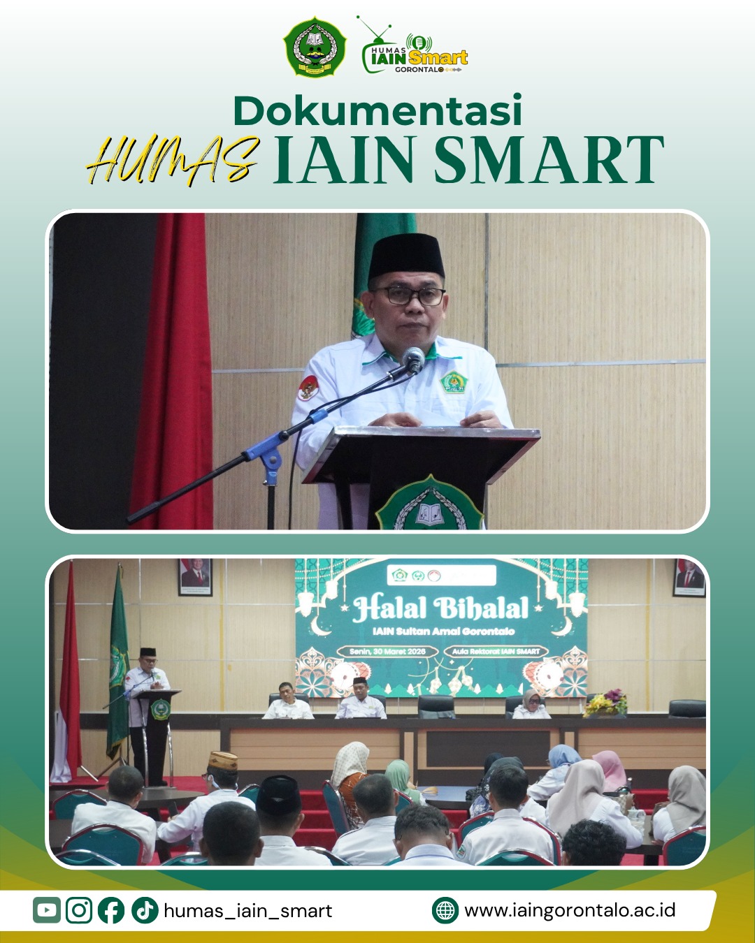 Dalam rangka mempererat tali silaturahmi di lingkungan kampus, Institut Agama Islam Negeri Sultan Amai Gorontalo (IAIN SMART) menggelar kegiatan Halal Bi Halal yang melibatkan seluruh unsur civitas akademika. Kegiatan tersebut berlangsung pada hari senin tanggal 30 maret di Aula Rektorat Kampus 1 IAIN Sultan Amai Gorontalo dan menjadi momentum penting untuk memperkuat kebersamaan sekaligus komitmen bersama dalam membangun institusi ke arah yang lebih maju.Acara Halal Bi Halal ini dihadiri oleh pimpinan universitas, pimpinan fakultas, dosen, tenaga kependidikan, serta berbagai unsur civitas akademika lainnya. Suasana penuh kehangatan dan kebersamaan tampak mewarnai kegiatan tersebut, yang tidak hanya menjadi ajang saling memaafkan pasca Ramadan, tetapi juga menjadi ruang refleksi dan penguatan nilai-nilai kebersamaan dalam lingkungan akademik.